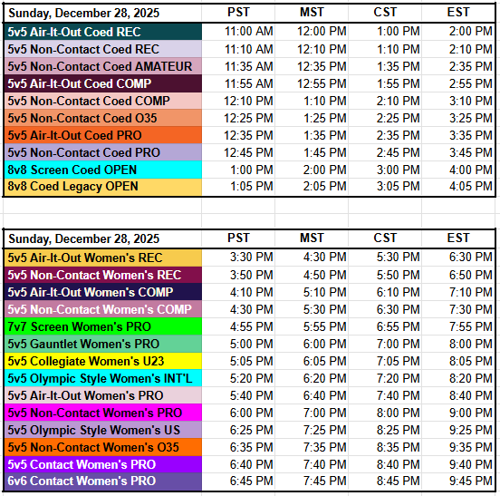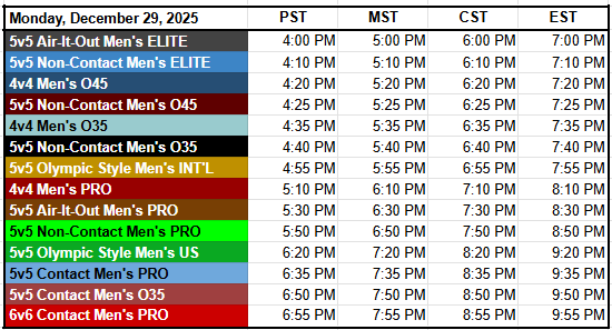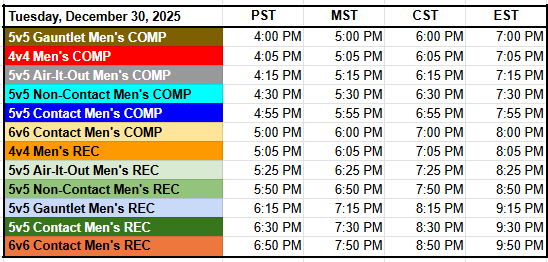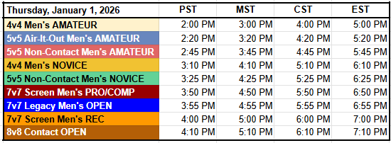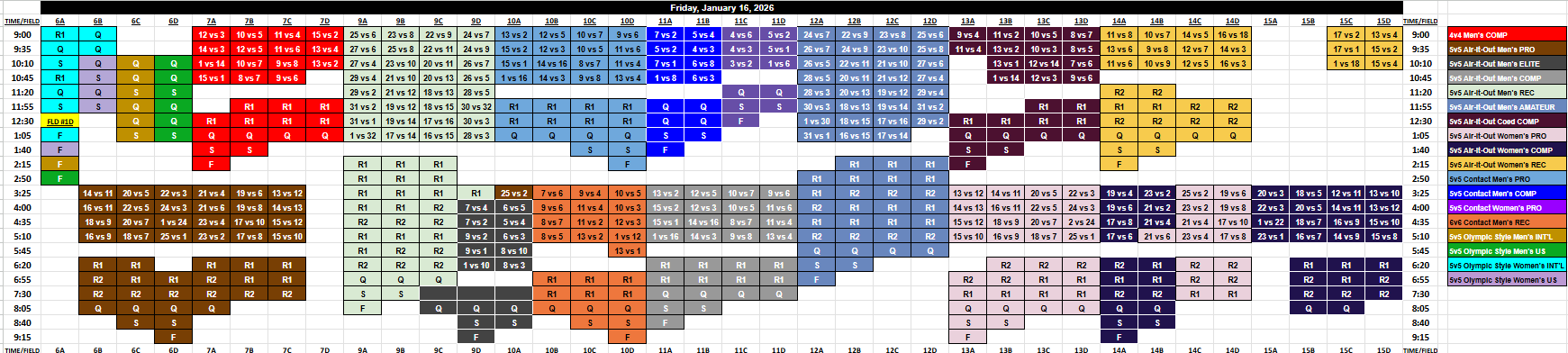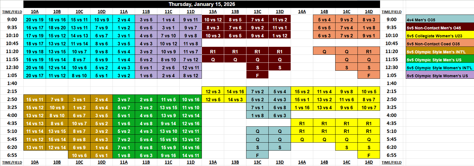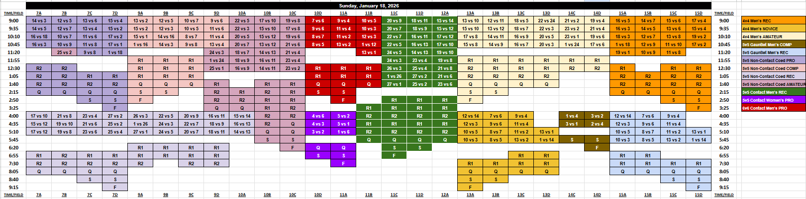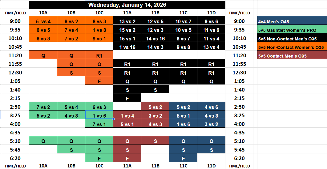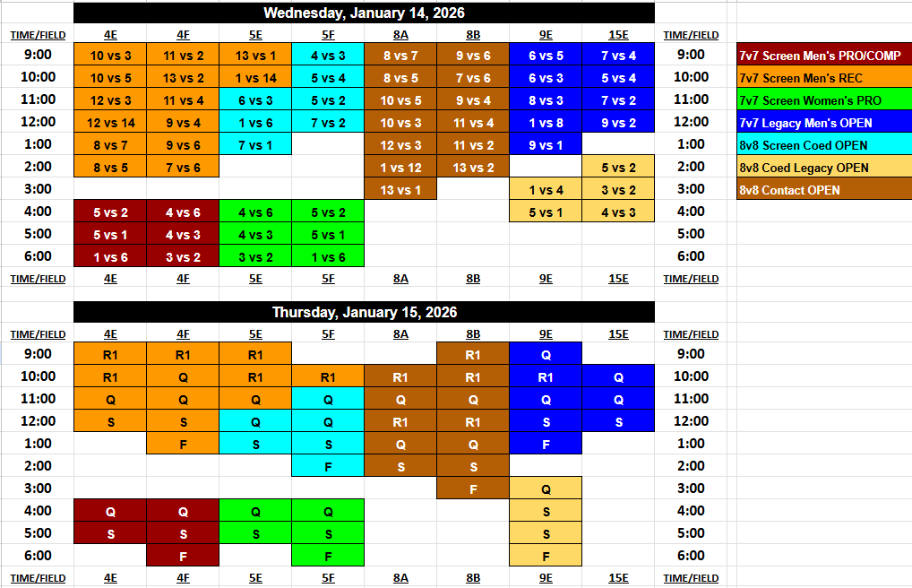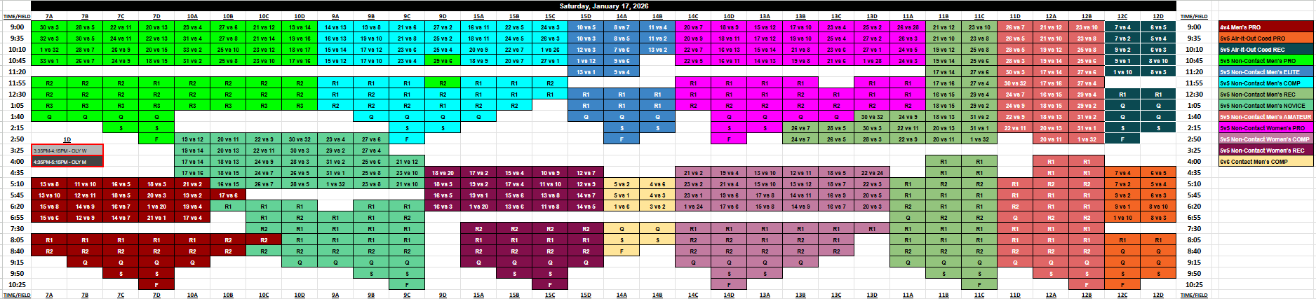 Draft Order is based on USA Flag Ranking Points, with the exception of guaranteed draft seed spots won at our 2025 Arlington National Championship winners. All teams with 4 or more teams in their division will battle to select their placement on the schedule, where you’ll have a say in who you play, what time and on what field. Captains will select which seed they want on the schedule in reverse draft order, and you can take any spot on the board, bumping out another team if desired, who would be forced to take an open spot.