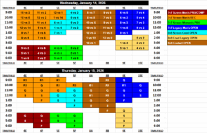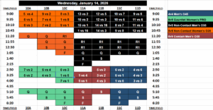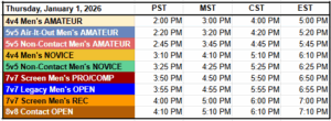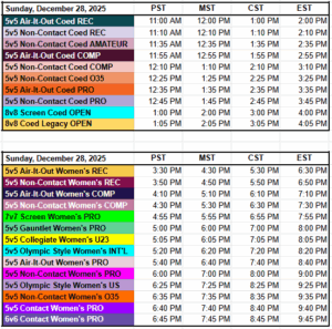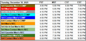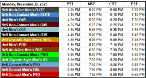 Team A has the registered last and selects first, and is on the clock (1 minute to decide) . They select the 5th seed on the schedule so they can start at a later time. Team B is up next, and selects the 1st seed to avoid being in the same pool as Team A. Team C is up next, and decides they want to bump Team A out of their spot and steals the 5th seed. Team A then is forced to take an open spot on the board, and selects the 2nd seed to place themselves in the same pool as Team B who they think they matchup well against. This continues all the way through the draft until the last 3 teams are left. The only rule exception is that if any of the top teams (top 3 teams for divisions with 19 or less teams; top 4 teams for divisions 20+ teams; top 5 teams for divisions with 30+ teams) get bumped out of their spot, they are allowed to bump again. So if Team Z has the registered first and is the last to draft and bumps Team X out of their spot who was also one of the top teams, Team X would be allowed to bump another team out so they’re not stuck with the only open spot on the board having earned one of the top team spots draft position. The team they bump would have to take the last open spot on the board, and the draft would be complete! It is a fun way to select a spot and gives each team some input on when, where and who they play!