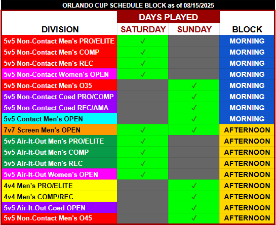 The graphic below lays out which divisions will and will not overlap, along with days played. The morning block will not conflict with the afternoon block AT ALL. So teams can play in a morning style and an afternoon style with no conflicts.