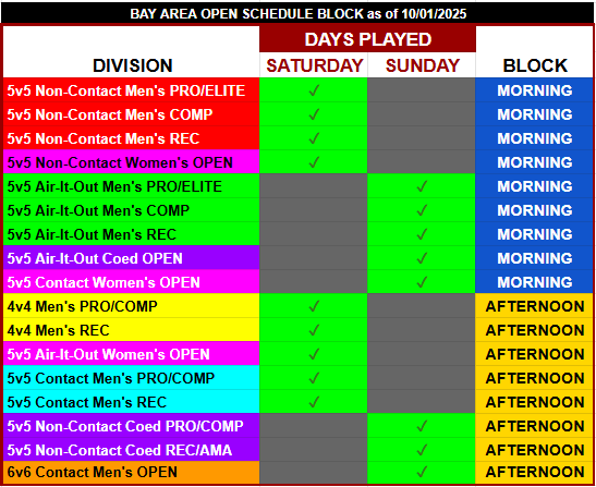 The graphic below lays out which divisions will and will not overlap, along with days played. The morning block will not conflict with the afternoon block AT ALL. So teams can play in a morning style and an afternoon style with no conflicts.
