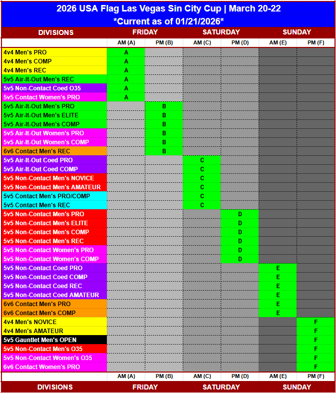 Below are the divisions offered at this tournament along with their entry cost, prize and roster max. Competitive levels are PRO (A), Elite (B), Competitive (C), Novice (D) and Amateur (E). If you are not certain which division is right for you or what it overlaps with, please email us at [email protected]Â to make sure!
